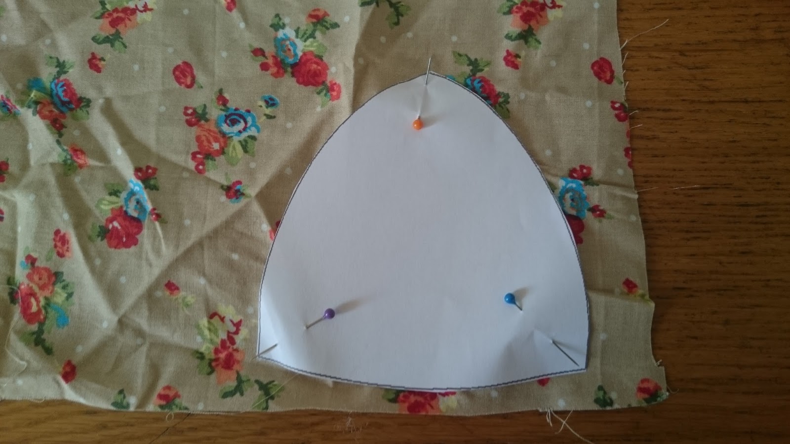מניחים את הגיזרה על הבד, נעזרים בסיכות,וגוזרים עם מרווח של חצי ס"מ