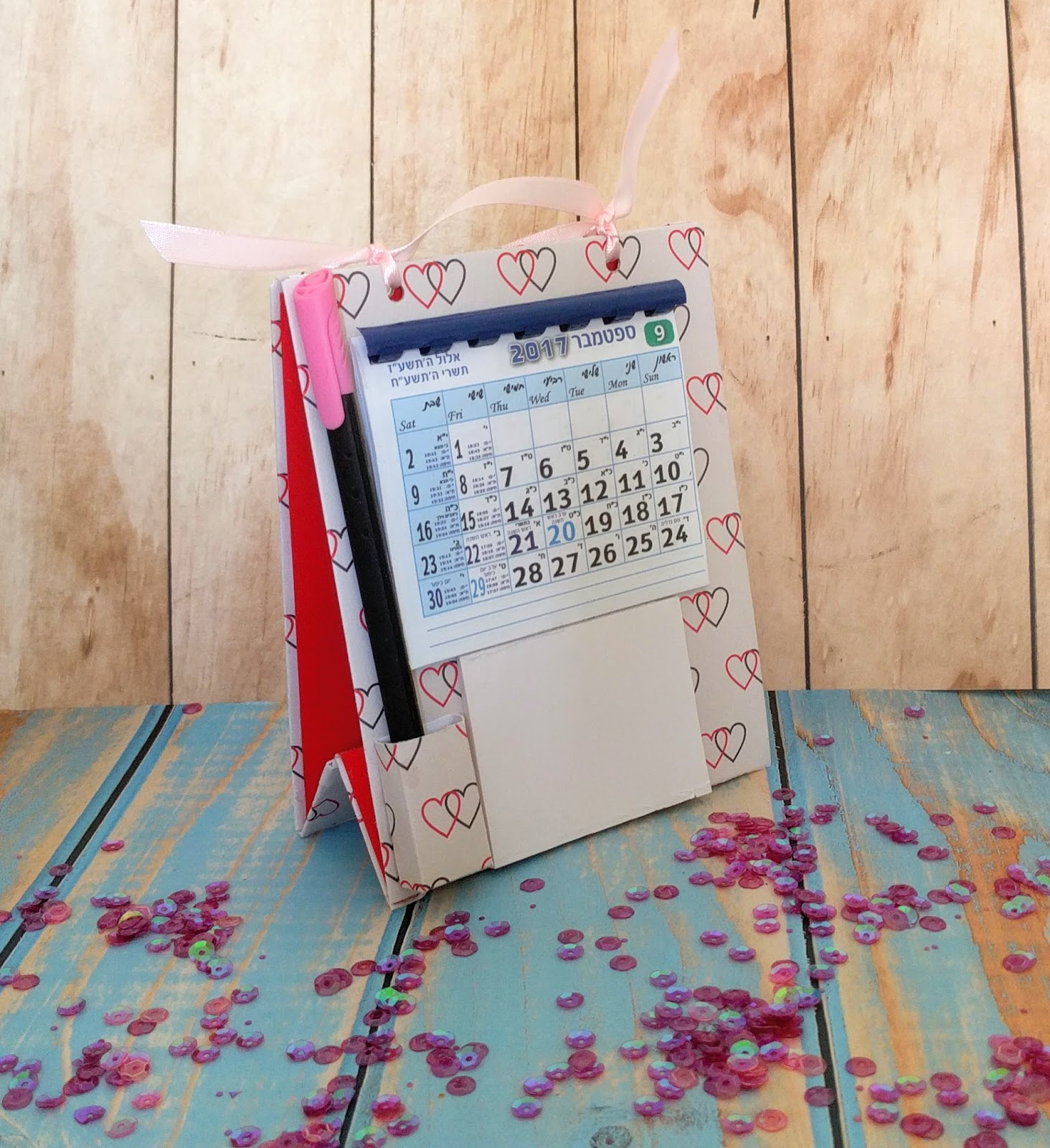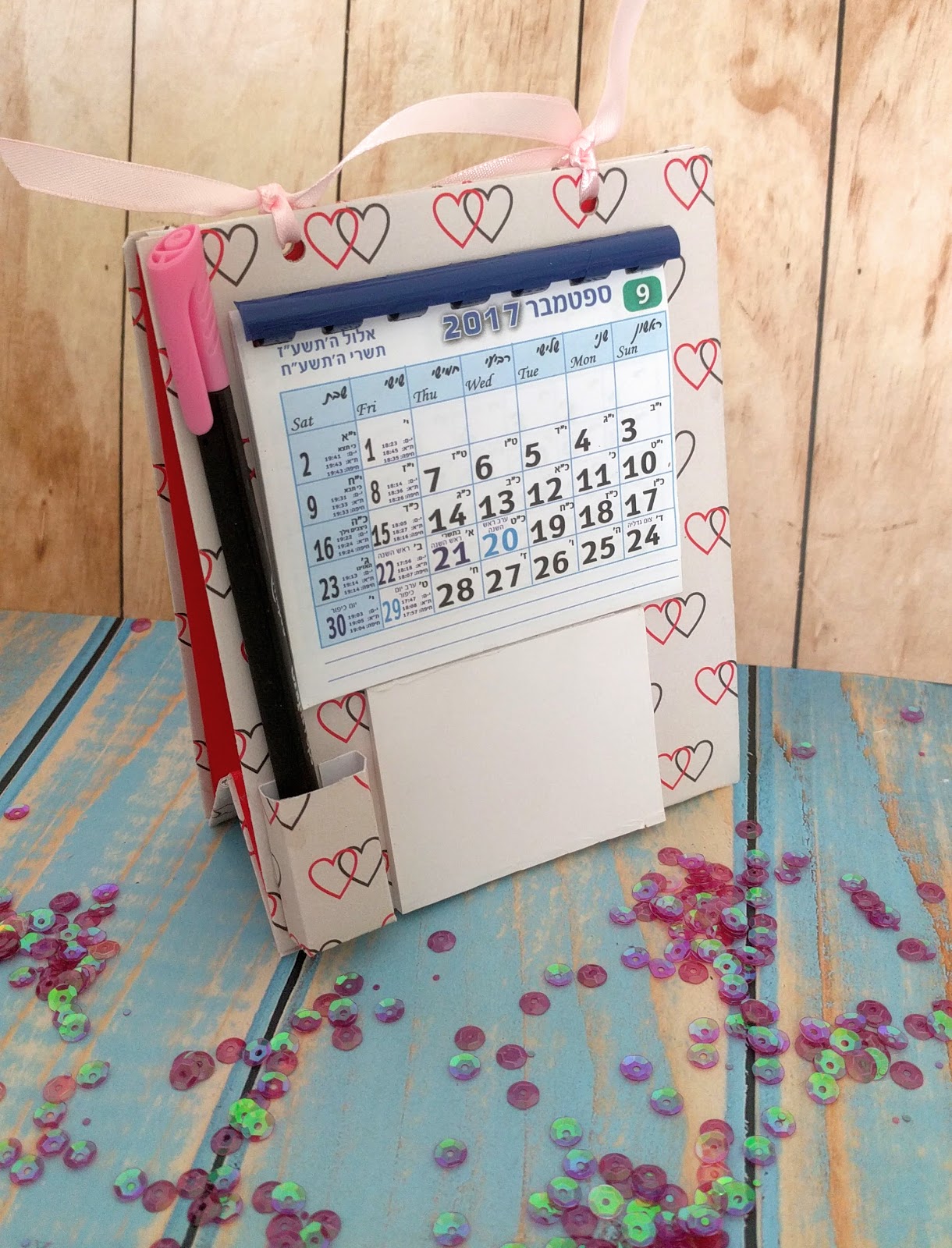 יש אפשרות לשחיל את הטבעות, או כמו שאני עשיתי, קשרתי שני סרטים יפים. ללוח השנה מורידים את המגנט, ועל הדף האחרון שמים דבק ומדביקים למעמד.