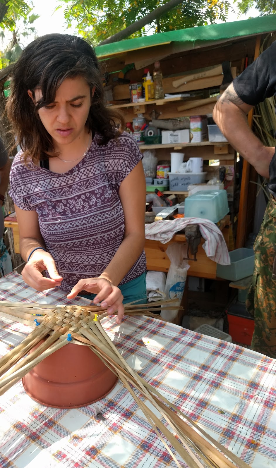 ואז הזוגי ההפתיע אותי עם מחשבה מקורית שממש נדלקתי עליה, וביחד התחלנו לחפש מקור ללימוד – קליעה בחומרים שונים, עם דגש על קליעת כובע מקני סוף.