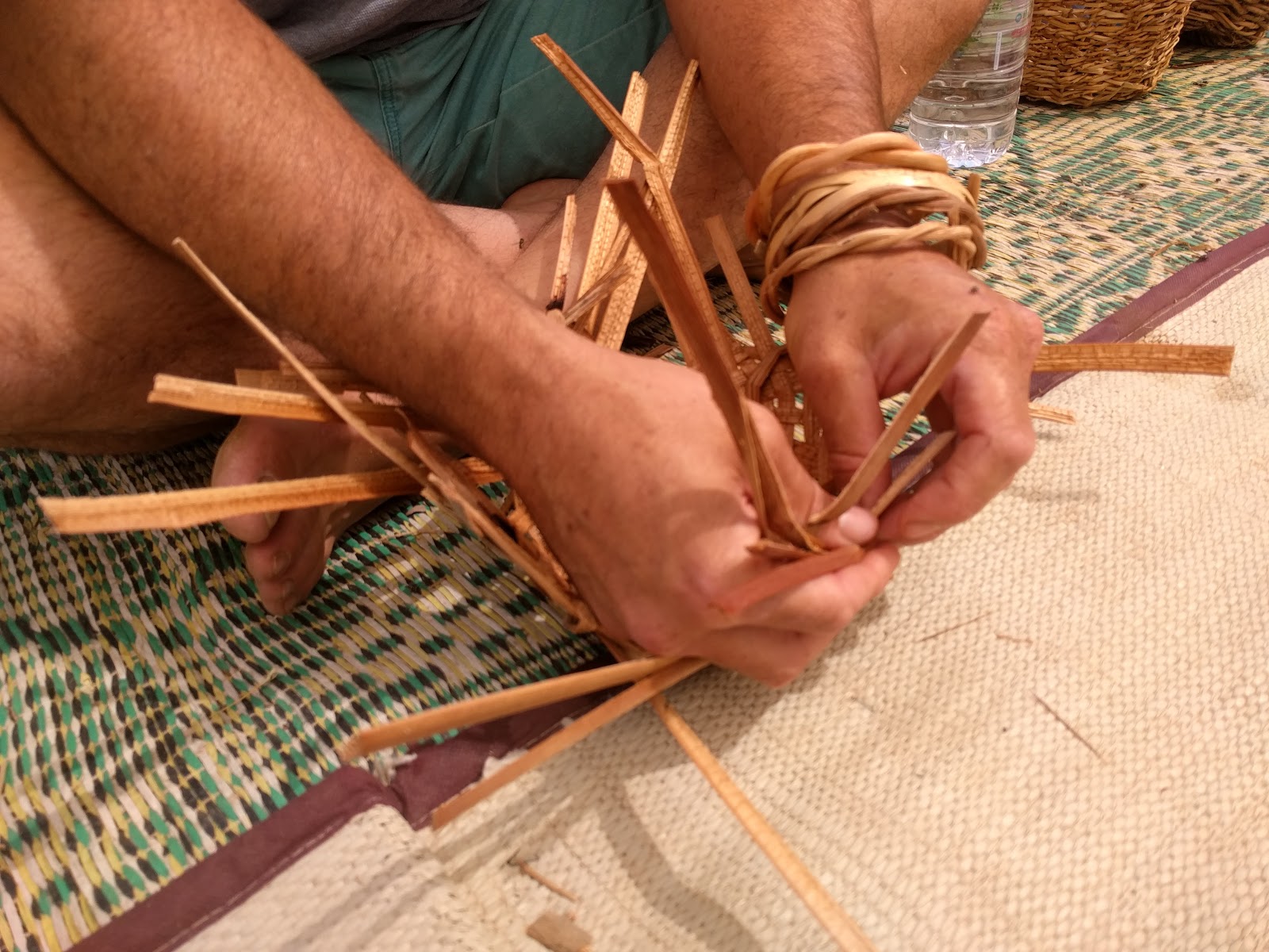 פה הוא קולע מענף של ציפור גן עדן – שאותו הוא גוזם ומייבש מפצל מנקה וקולע לסל.