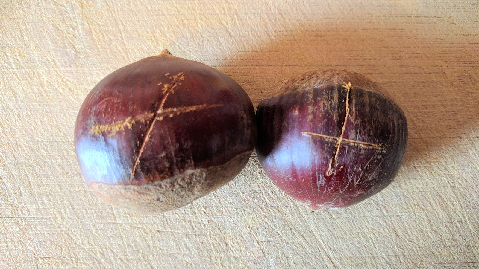 חותכים, X בערמונים ומכניסים לתנור ב 250 מעלות לרבע שעה (בדיוק הזמן שלוקח להכין את השקיות).