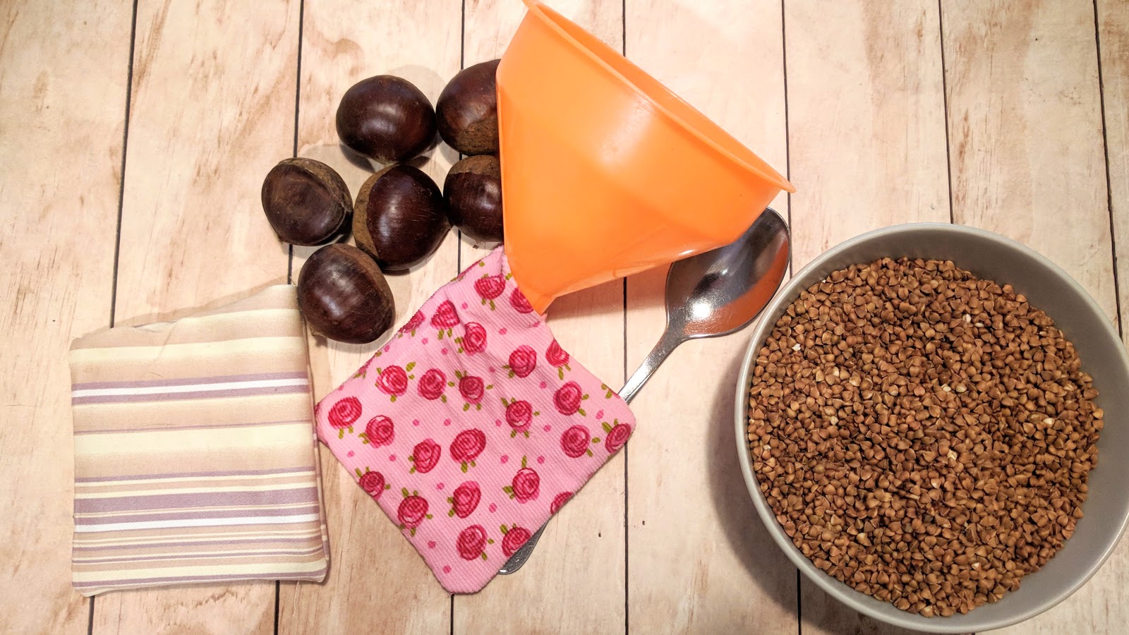 • שקית של כוסמת (או כמו שהילדים קוראים לזה – כוס אמק). אפשרי לשים זרעי פשתן, או אורז ולהוסיף פרחי לוונדר.